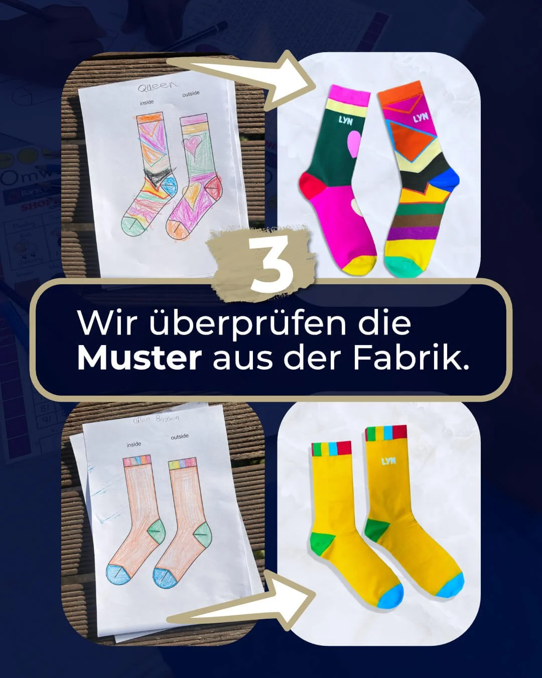Gemeinsam mit den Kindern haben wir aus über 50 selbstgemalten Socken Designs zwei ausgewählt, produziert und verkaufen sie heute in unserem OnlineShop.